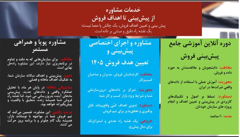 یکی از فعالیت های کلیدی هر سازمانی، اطلاع از وضعیت آتی فروش می باشد. بدون شک پیش بینی فروش را می توان یکی از مهمترین عملیات برنامه ریزی فروش دانست. بهره برداری از فرصت ها در گرو پیش بینی دقیقی از آینده بازار و فروش آتی شرکت است. ردپای پیش بینی های فروش را در سراسر فرآیند مدیریت فروش از تعیین اهداف فروش، برآورد تعداد نفرات تیم فروش، طراحی سیستم های انگیزشی و شاخص های کلیدی عملکرد می توان یافت. در این خدمات مشاوره، پس از آشنایی با مجموعه ای از مدل های پیش بینی در شرایط مختلف نظیر عدم قطعیت، پر ریسک و کمبود اطلاعات، مثال هایی از کاربرد این مدل ها در شرایط واقعی طرح خواهد شد. این مثال ها از کسب و کارهای ایرانی و با هدف درک بهتر مفاهیم ارائه شده، ملاحظات و نکات کلیدی به هنگام استفاده از این مدل ها می باشد.